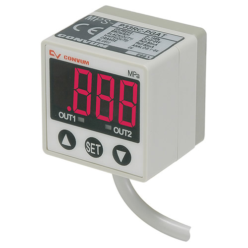 MPS-33 pressure sensors have two independent PNP or NPN outputs with an additional 1-5 VDC analog output. The MPS-33 have a red LED pressure display for visual monitoring. Sensors can be used to monitor vacuum pressure and up to 145 psig.Applications for pressure sensors are numerous and important in today's high-tech manufacturing environment. Outputs can be programmed normally passing or non-passing and in either Hysteresis Mode or Window Comparative Modes. In Hysteresis Mode, the user sets the switch point and reversing point. In Window Comparator Mode, the user sets the hi and low pressure band of operation. In addition to electrical outputs, these sensors have additional programming options that can be integrated into the system logic for additional benefits. Choose the best pressure sensor for the application based on pressure range, output type and additional programming options.