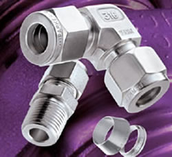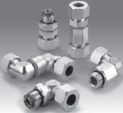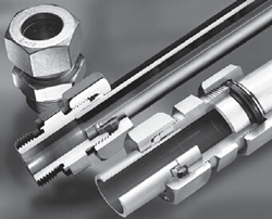 The ferrule "bites" into the tube to form a seal. No flaring or flanging is needed. EO-2 fittings employ elastomeric seals.