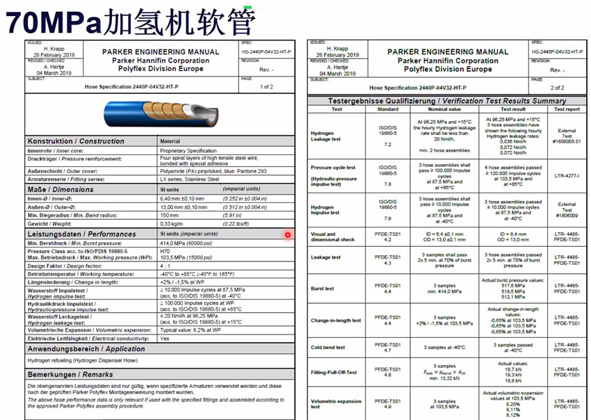 派克70Mpa加氫機(jī)軟管 Hydrogen Hose 2440P-04V32 | #2440P-04V32