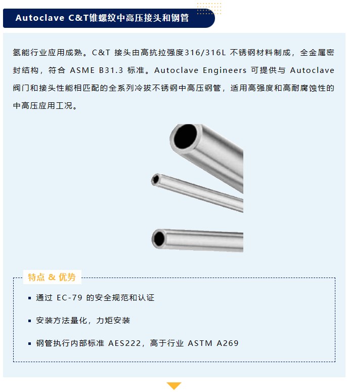 氫能行業應用成熟。C&T 接頭由高抗拉強度316/316L 不銹鋼材料制成,全金屬密封結構,符合 ASME B31.3 標準。Autoclave Engineers 可提供與 Autoclave 閥門和接頭性能相匹配的全系列冷拔不銹鋼中高壓鋼管,適用高強度和高耐腐蝕性的中高壓應用工況。
