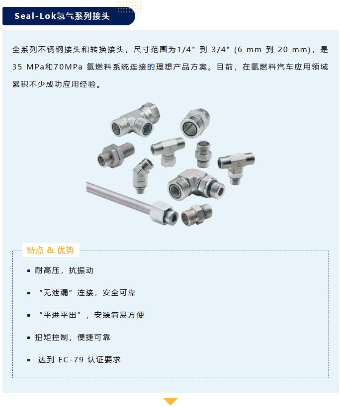 全系列不銹鋼接頭和轉換接頭,尺寸范圍為1/4" 到 3/4" (6 mm 到 20 mm),是 35 MPa和70MPa 氫燃料系統連接的理想產品方案。目前,在氫燃料汽車應用領域累積不少成功應用經驗。