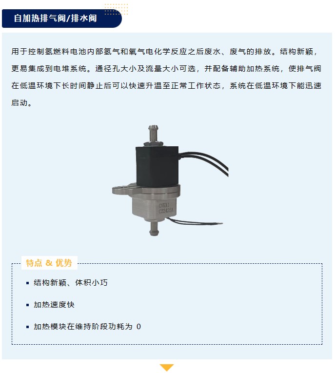 用于控制氫燃料電池內部氫氣和氧氣電化學反應之后廢水、廢氣的排放。結構新穎,更易集成到電堆系統。通徑孔大小及流量大小可選,并配備輔助加熱系統,使排氣閥在低溫環境下長時間靜止后可以快速升溫至正常工作狀態,系統在低溫環境下能迅速啟動。