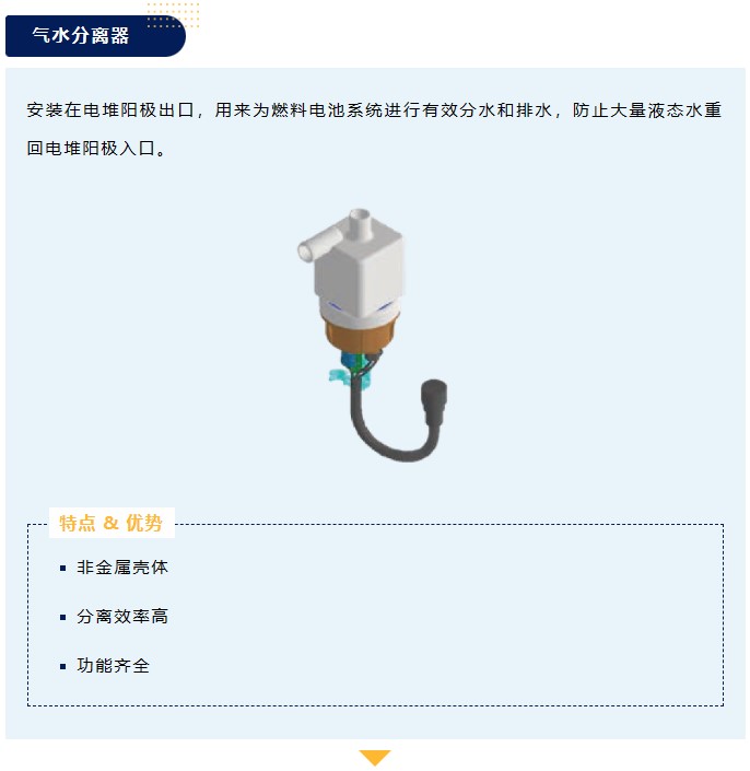安裝在電堆陽極出口,用來為燃料電池系統進行有效分水和排水,防止大量液態水重回電堆陽極入口。