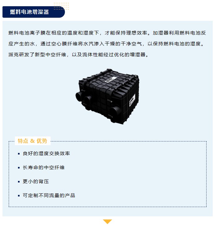 燃料電池離子膜在相應的溫度和濕度下,才能保持理想效率。加濕器利用燃料電池反應產生的水,通過空心膜纖維將水汽滲入干燥的干凈空氣,以保持燃料電池的濕度。派克研發了新型中空纖維,以及流體性能經過優化的增濕器。