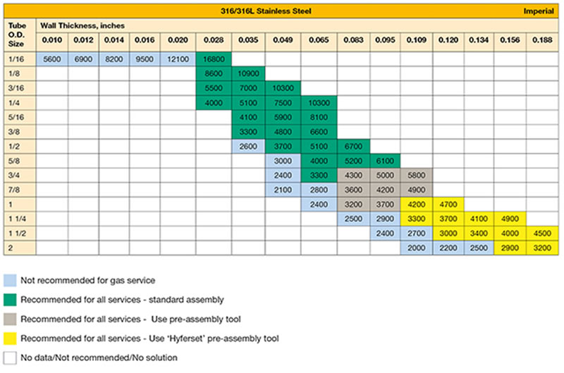 只有當儀表管提供徑向阻抗且管材硬度較套圈硬度小時,才能實現穿透。厚壁儀表管有助于提供阻力,下表提供了一系 列壁厚選項,以便安全使用派克管件。藍色等級表示直徑和壁厚的組合,此組合不適用于氣體服務。