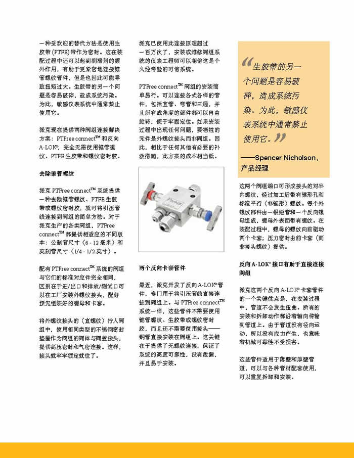 最近,派克開發了反向 A-LOK 管件,專門用于將引壓管線直接連接到閥組上。與 PTFree connect系統一樣,這些管件不需要使用錐管螺紋、生膠帶或螺紋密封膠,而且還不需要使用接頭——鋼管直接安裝在閥組上。這關鍵在于提供了無螺紋連接,保證了系統的高度可靠性,沒有泄漏,并且易于安裝。