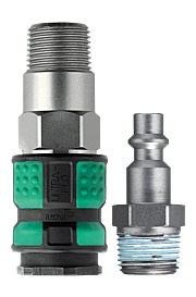 派克優質的快換接頭系統,公稱通徑為5.5mm,用于氣動及流體輸送應用,承壓可達35bar,快換接頭符合ISO 6150 B標準結構,目前可供材料為黃銅/碳鋼帶2件式塑料套筒。派克1423系列快換,是一款優質的 1/4英寸的工業快換,符合ISO 6150 B標準結構。該系列適用于大于平均空氣消耗量的壓縮空氣應用。Rectus1423系列使用單手操作系統。超高流量閥保證最佳流量和較低壓降。該系列快換接頭使用了非常堅固的,并且符合人體工程學結構,2件式的塑料套筒。Rectus Tema premium industrial coupling 1/4" according to ISO 6150 B. Suitable for compressed air applications with greater than average air consumption.Coupling system with single-hand operation. UltraFlo