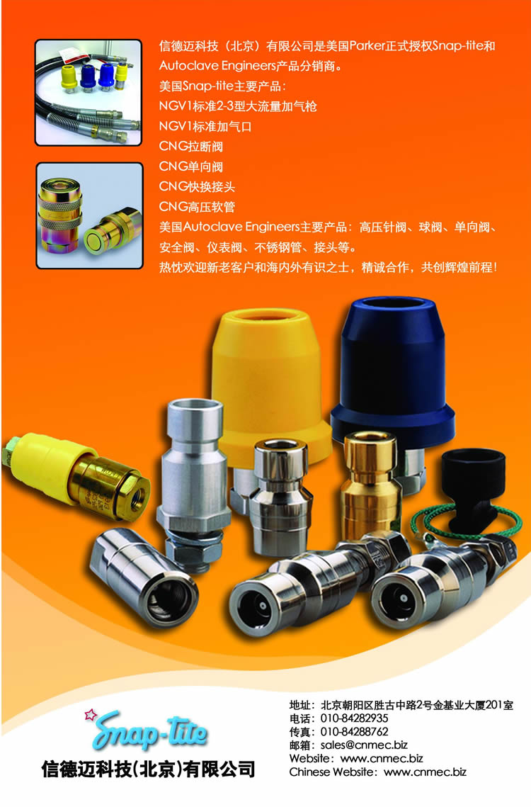 信德邁參展產品:Snap-tite CNG加氣機拉斷閥 | Snap-tite CNG專用高壓軟管 | Snap-tite NGV加氣咀 | Snap-tite CNG單向閥 | Snap-tite NGV加氣槍頭 | Snap-tite CNG專用快速接頭 | Snap-tite CNG長管拖車專用快速接頭 | Parker CNG天然氣快速接頭H8-62,H8-63