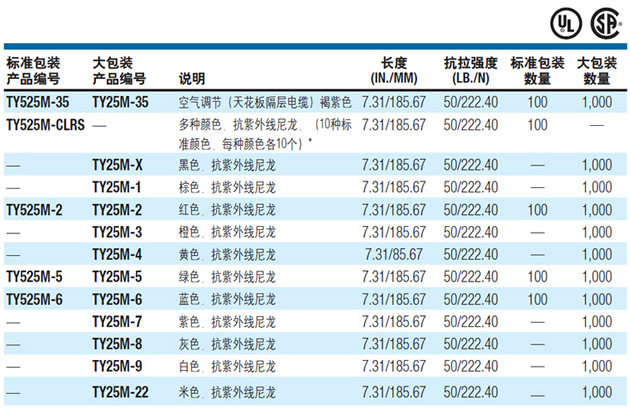 注:Ty-Rap電纜扎帶的產(chǎn)品目錄基本編號指的是本色(無色)尼龍扎帶(不含抗紫外線添加劑),這種產(chǎn)品不適用于室外應(yīng)用。對于彩色抗紫外線尼龍Ty-Rap電纜扎帶來說,請在基本編號后面添加后綴數(shù)字。例如,TY25M 是僅適用于室內(nèi)的本色(無色)尼龍扎帶,而TY25M-2 是室內(nèi)外均可使用的紅色抗紫外線尼龍產(chǎn)品。關(guān)于具體訂購信息,敬請咨詢信德邁公司客服部門010-84282935。