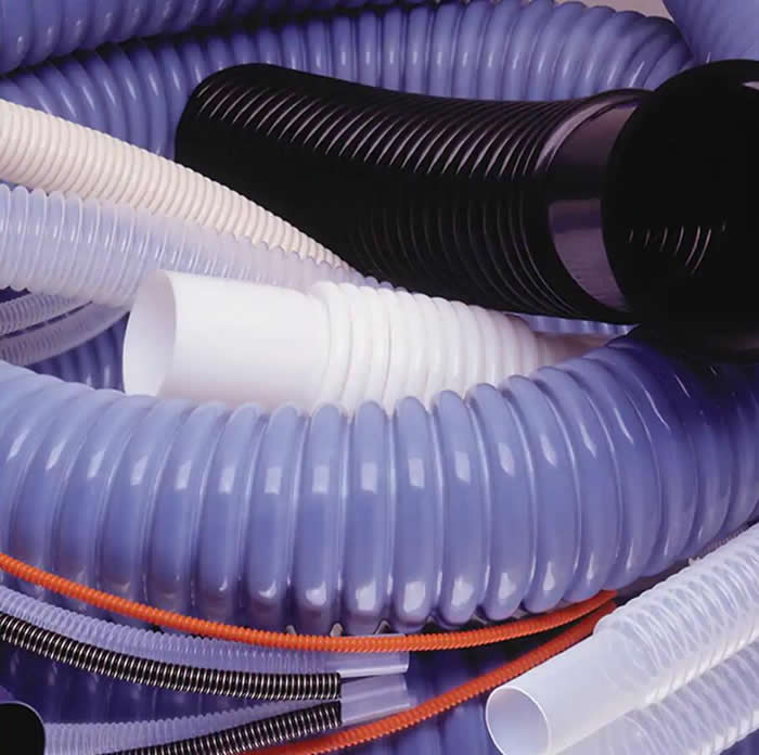 Convoluted tubing's helical constructions are molded into the tubing and will not pull out as the tube is extended. Like other fluoropolymers, Parker convoluted tubing resist corrosive liquids and gases, and has a non-stick surface with low permeability. All of these products can be manufactured with a conductive I.D. or as a fully conductive tube to dissipate static build-up and they are available as bulk tubing or as a cut tube with added cuffs to create an attachable end for adding fittings or flanges.