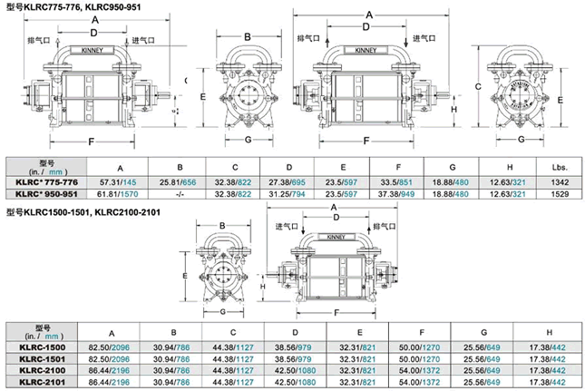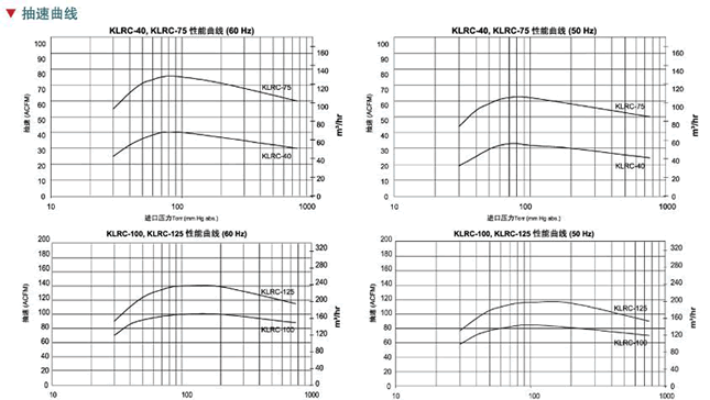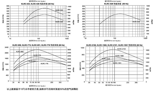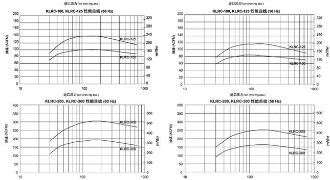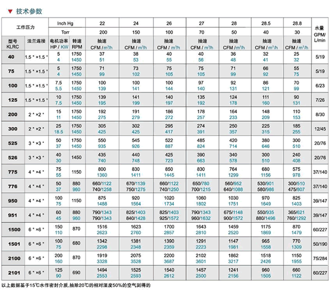 KLRC液環(huán)真空泵抽吸壓力可以低至4Torr(5.3mbara)。低壓下的工 作性能會受工作液的飽和蒸氣壓限制,工作液可以是水、油或流程液體。